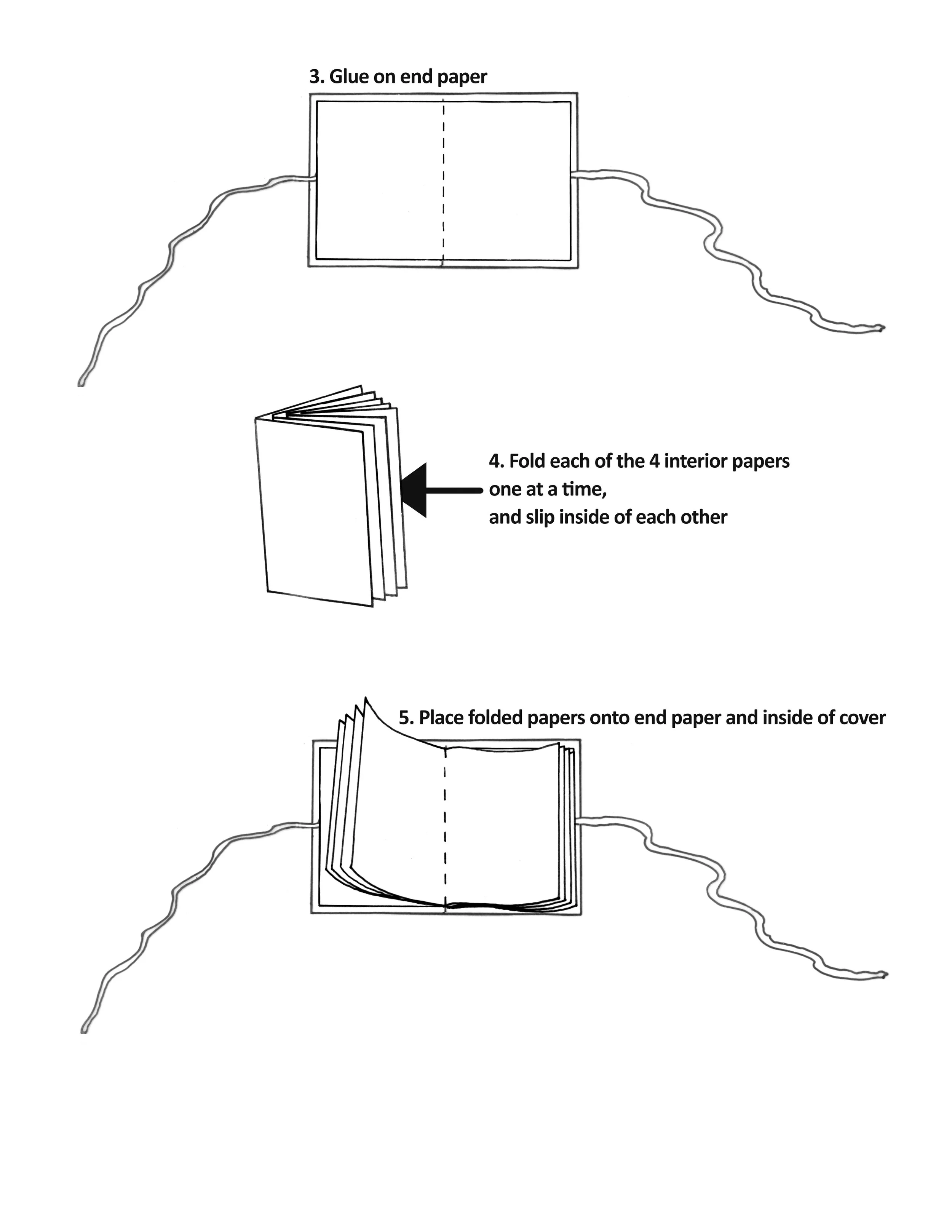 Apply glue to the center of the inside of your cover, lay yarn or string on top of glue and press. Leave long pieces of string hang off of each edge (you will use this to close your teeny, tiny book).