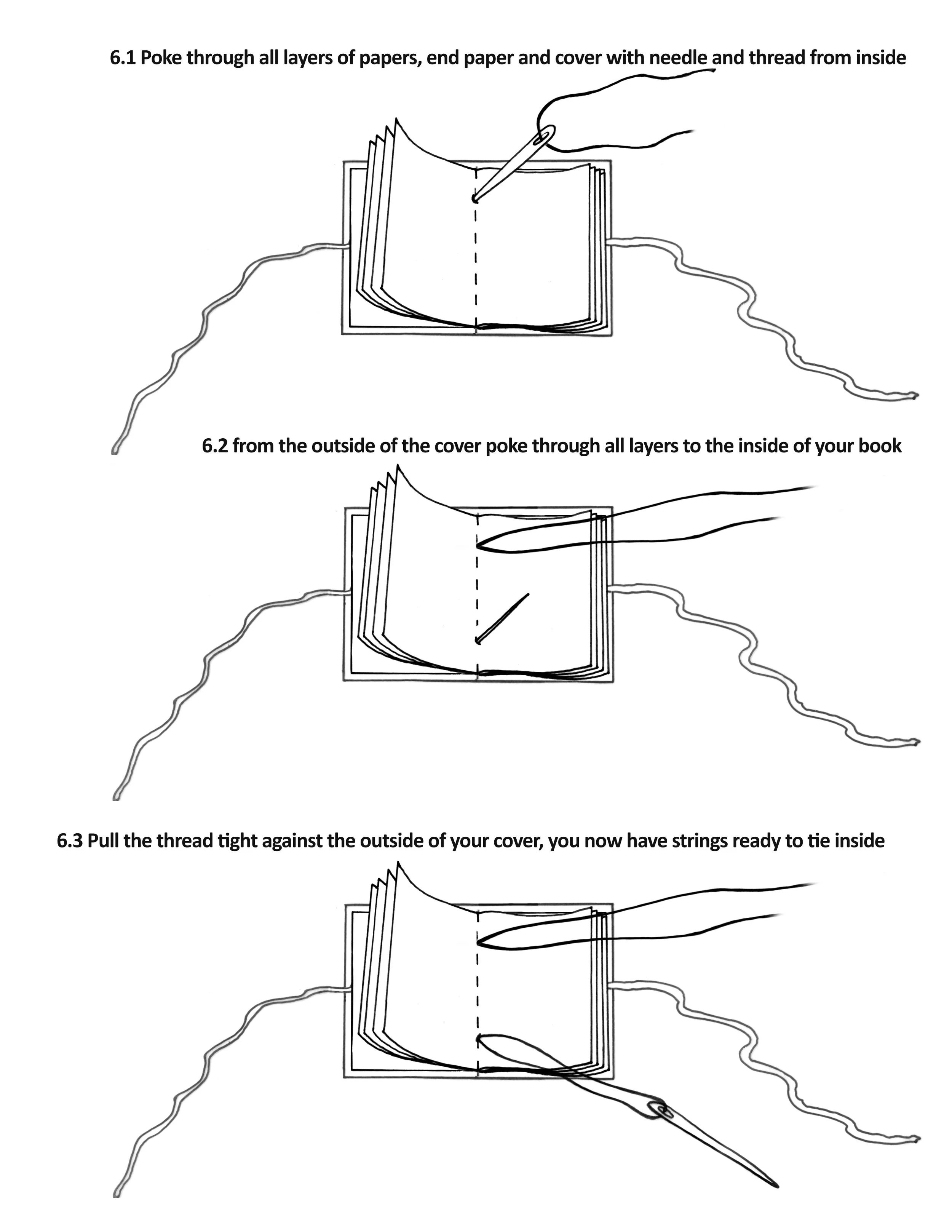 6.1 Take a sharp needle and thread and poke straight down all the way through all the layers of your book, leave long threads on the inside for tying.