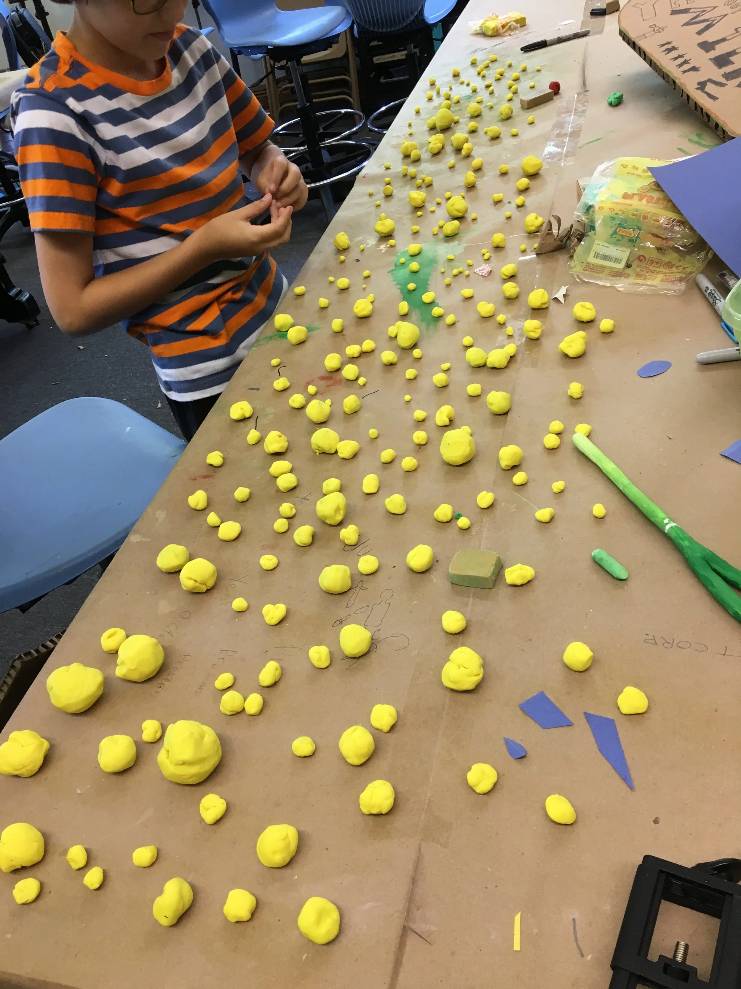 Look at the yellow, clay balls created by an LVA Camper, they turned the art table into a work of art, using the art elements of Color and Form to create the art element of Pattern.